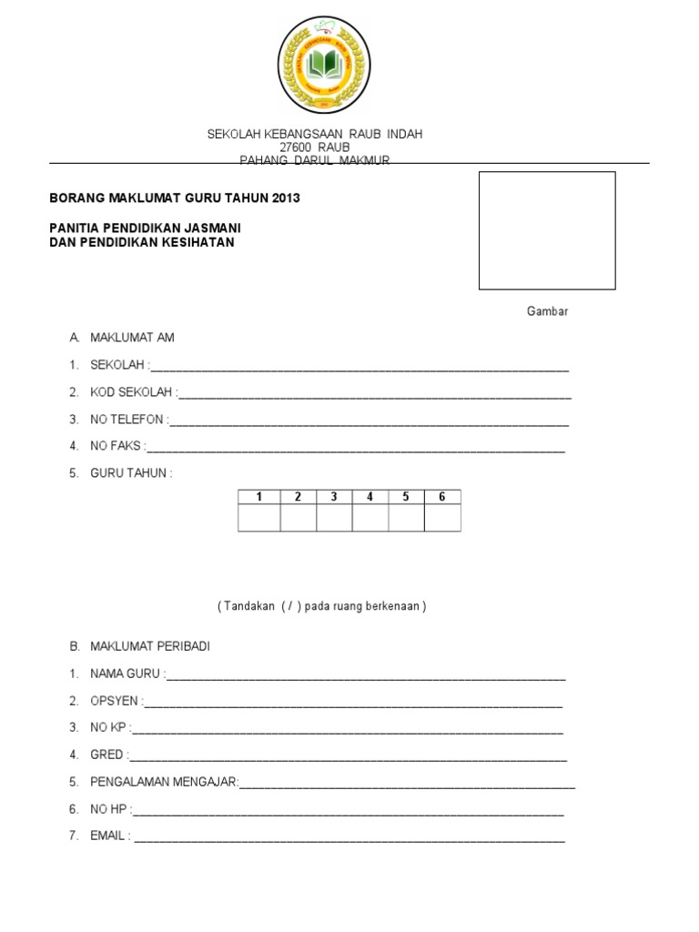 Borang Maklumat Guru Tahun 2013 Panitia Pendidikan Jasmani Dan Pendidikan Kesihatan