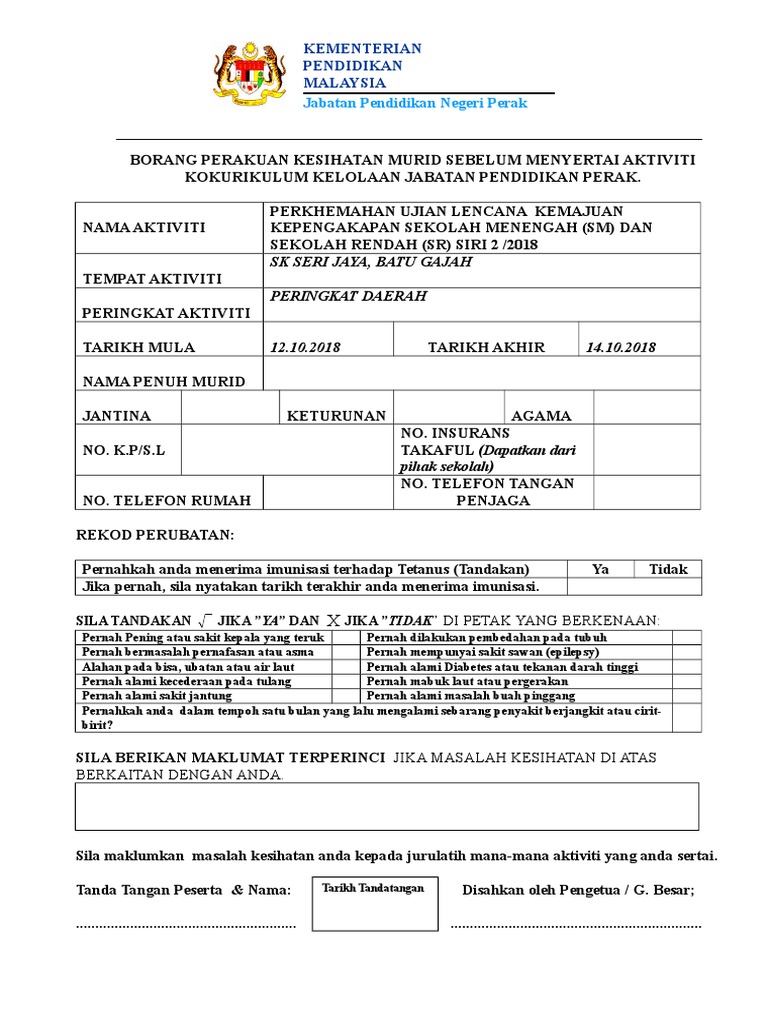 Borang perakuan kesihatan murid. Bersama sama ini dilampirkan borang perakuan kesihatan pemohon borang pemeriksaan fizikal dan laporan perakuan pegawai perubatan untuk dilengkapkan oleh. Ya tidak 6. Borang kebenaran waris borang perakuan kesihatan sila klik link dibawah bagi muat turun borang dalam format pdf. Surat kebenaran waris perakuan kesihatan borang pendaftaran penyertaan aktivi.
