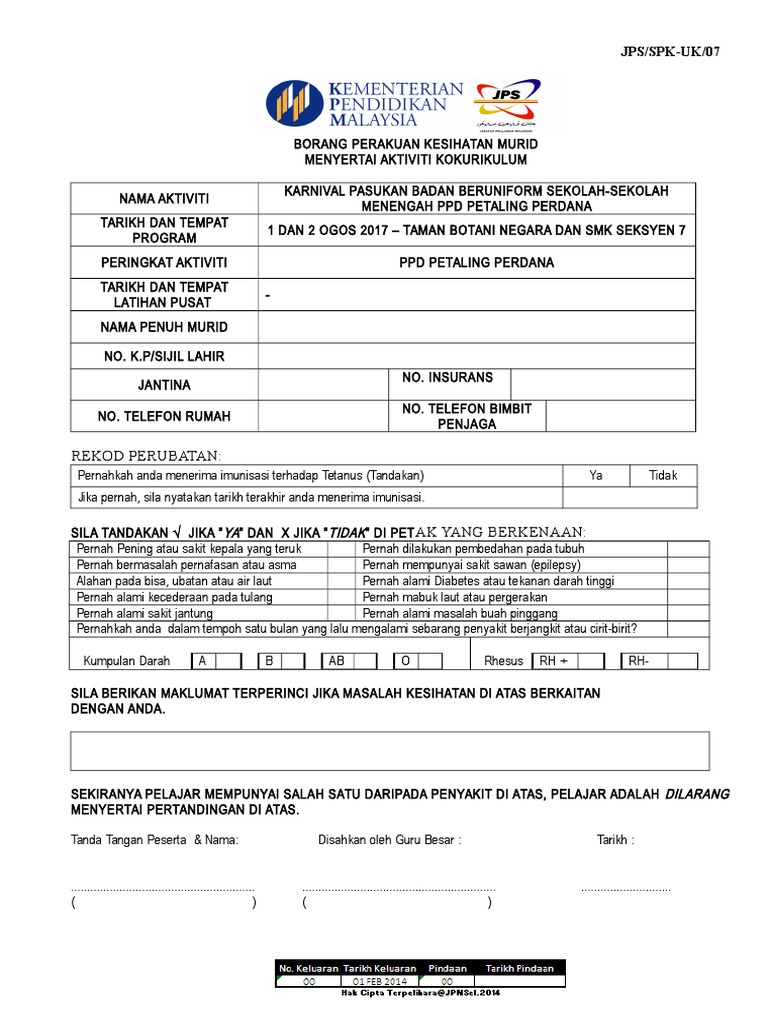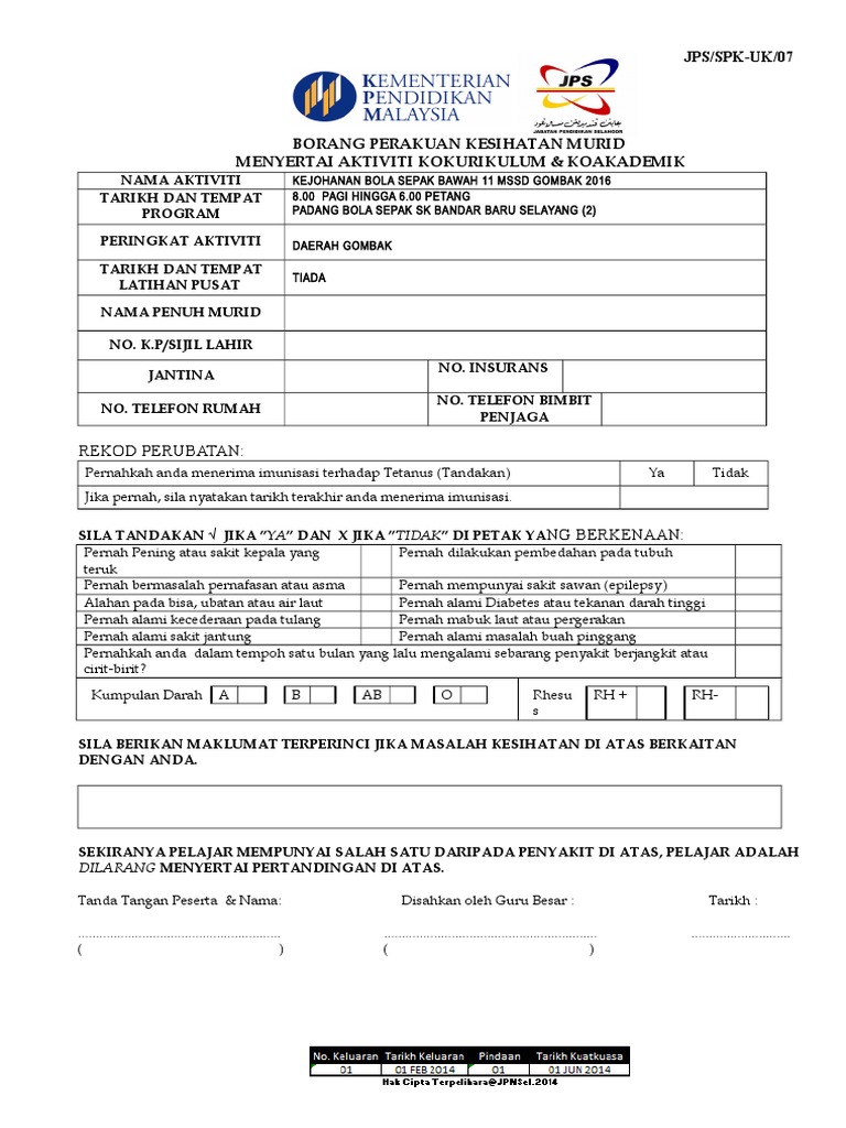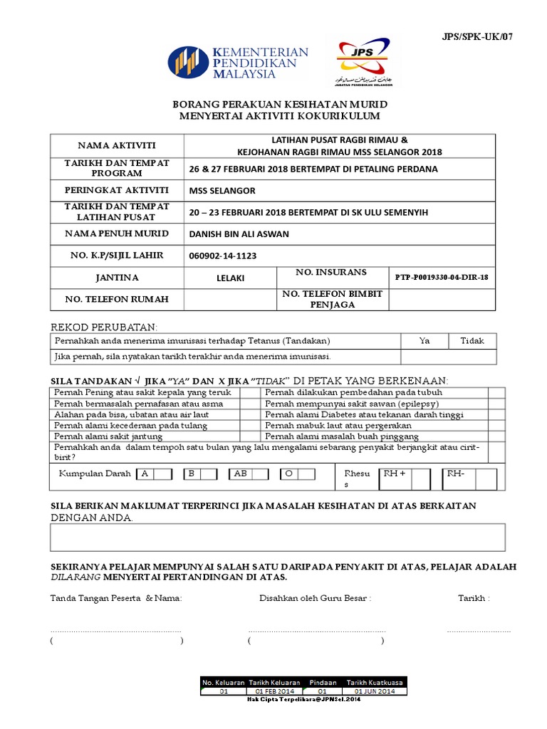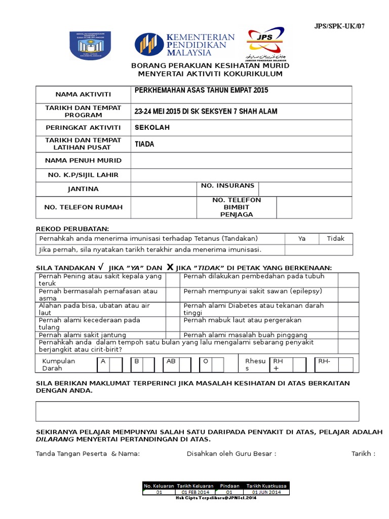 Borang akuan pengisytiharan kesihatan murid berkeperluan khas a. Tel 603 2268 7333 fax 603 2268 7555. Borang perakuan kesihatan murid menyertai aktiviti kokurikulum nama aktiviti karnival sains dan teknologi peringkat daerah hulu selangor 2015 tarikh dan tempat program 4 ogos 2015 di smk kalumpang hulu selangor peringkat aktiviti daerah hulu selangor tarikh dan tempat latihan pusat nama penuh murid no. Tingkatan satu 1 di sekolah berasrama penuh seperti dalam surat tawaran.