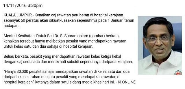 Caj Di Hospital Kerajaan Naik Harga Mulai Januari 2017