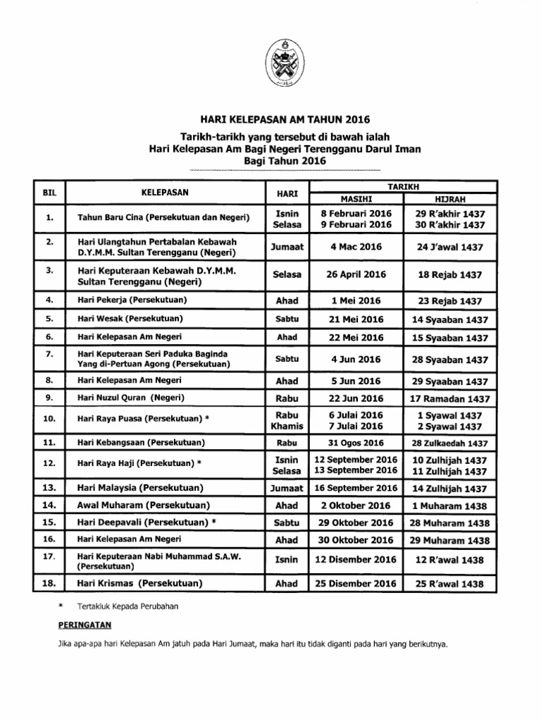 Kalendar Cuti Umum Terengganu 2016