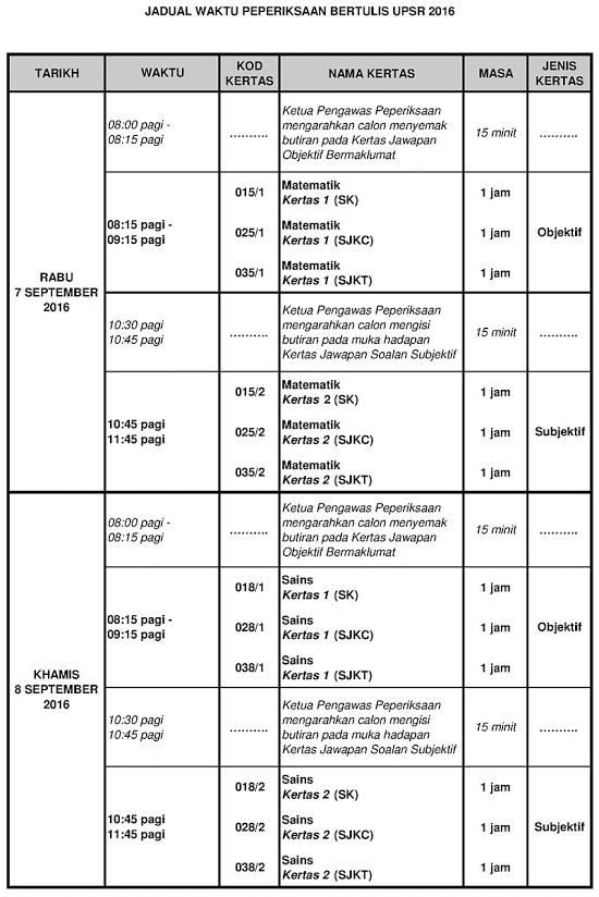 Jadual Waktu Peperiksaan Upsr 2016 Malay Viral