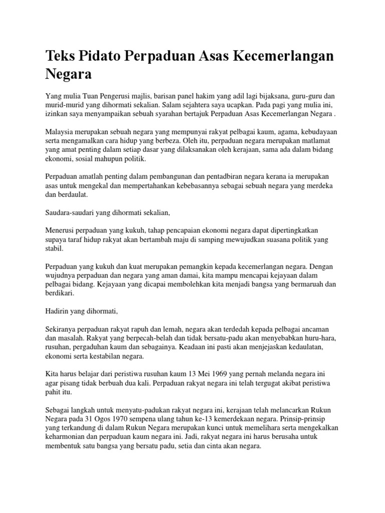 Teks Pidato Perpaduan Asas Kemajuan Negara Docx