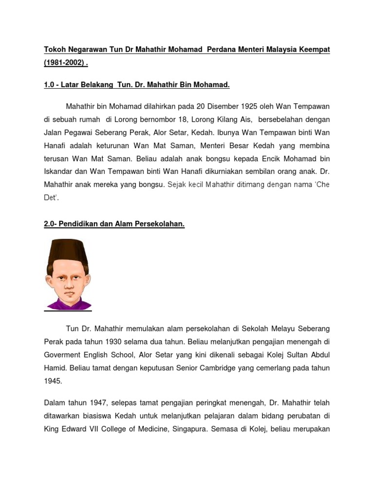 Dr Mahathir Latar Belakang Tun Dr Mahathir Bin Mohamad Yang Juga Digelar Sebagai Dr M Dan Nama Penanya Che Det Dilahirkan Pada 20 Disember 1925 Di Course Hero