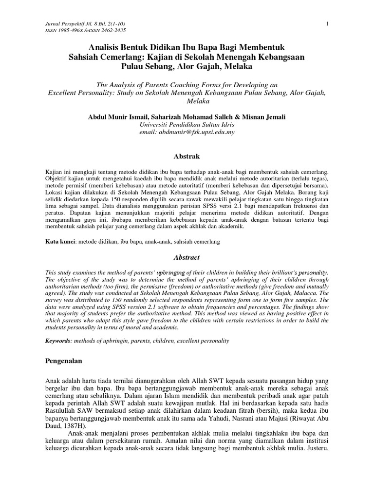 Analisis Bentuk Didikan Ibu Bapa Bagi Membentuk Sahsiah Cemerlang Kajian Di Sekolah Menengah Kebangsaan Pulau Sebang Alor Gajah Melaka