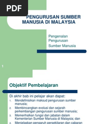 Oleh itu pengurus sumber manusia perlu memainkan peranan sebagai rakan strategik dan pakar rujuk dalam bidang pengurusan sumber manusia. Pengenalan pengurusan sumber manusia pengurusan sumber manusia memainkan peranan yang amat penting dalam mencapai tujuan ataupun matlamat pengurusan sumber manusia yang cekap dan berkesan akan menghasilkan individu yang berkualiti produktif dan seterusnya meminimumkan masalah yang berkaitan dengan sumber manusia masalah ini termasuklah. Pengenalan pengurusan sumber manusia 1. Kementerian sumber manusia tulisan jawi.