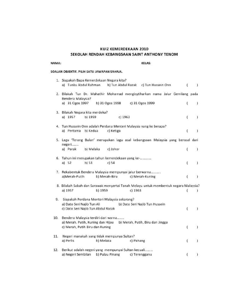 Contoh Soalan Kuiz Kemerdekaan Sekolah Rendah Persoalan T