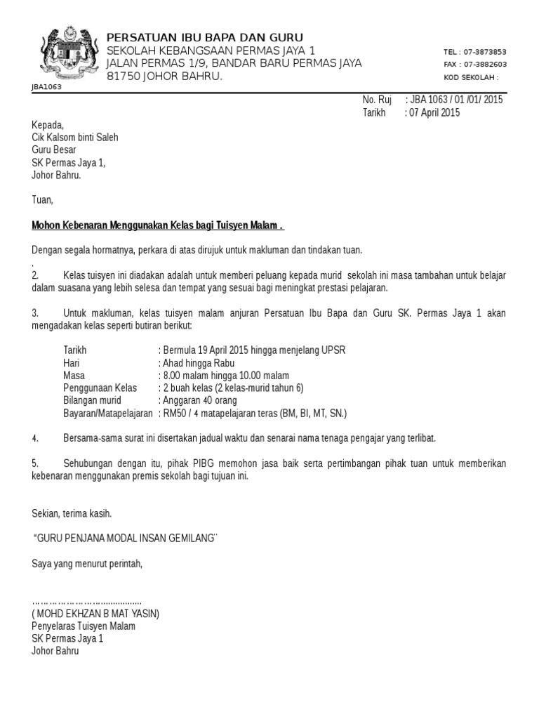 Contoh Surat Rasmi Permohonan Aktiviti Kelab Dan Persatuan Bahasa Melayu