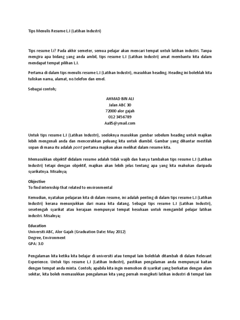 Panduan Internship Latihan Industri Resume
