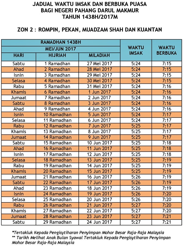 Jadual Waktu Berbuka Puasa Dan Imsak Bagi Negeri Pahang Tahun 1438h 2017m Blog Lea Azleeya