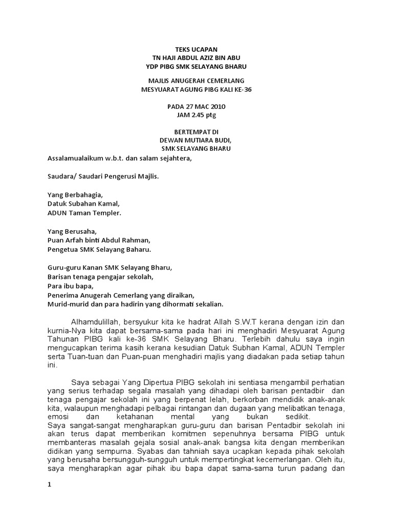 Teks ucapan pengetua mesyuarat agung pibg. Dengan itu saya dengan hormatnya menyerahkan majlis ini kepada yang dipertua pibg. Yang berbahagia encik ridhwan bin zalay pengarah. Ingatkah lagi kalian dengan entri saya ini pengacara majlis hari anugerah kecemerlangan 2013 hari ini buat kali kedua saya diberi kepercayaan untuk menjadi pengacara majlis lagi. Assalamualaikum warahmatullahi wabarakatuh salam sejahtera salam negaraku malaysia.