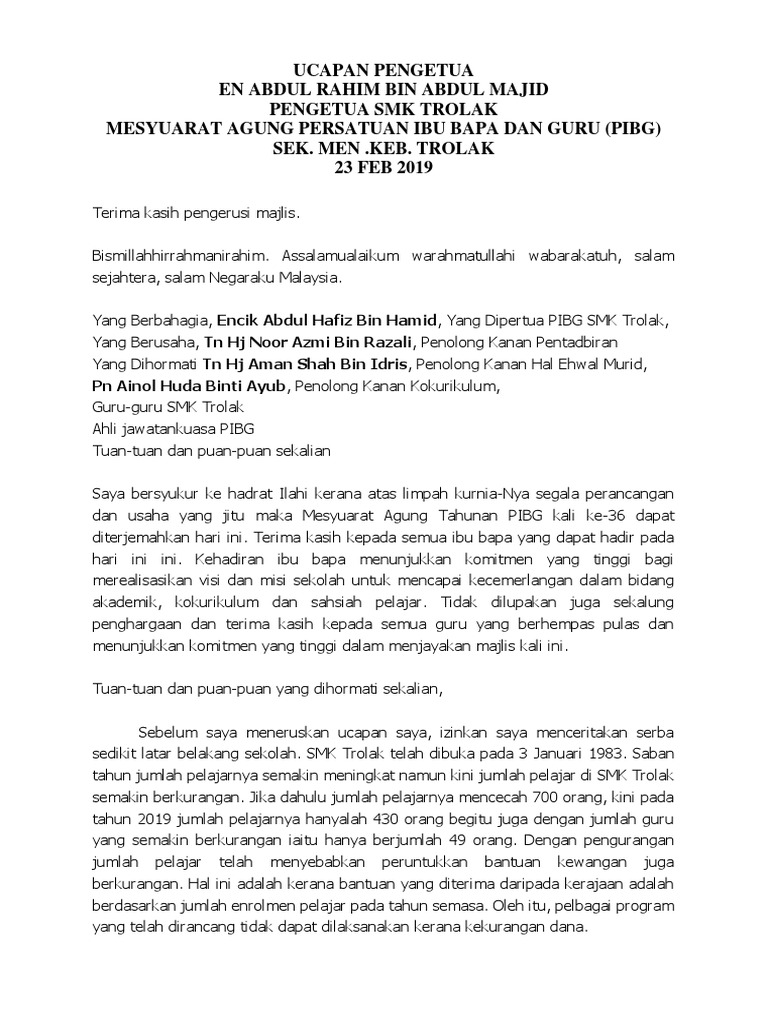 Teks ucapan pengetua mesyuarat agung pibg 2017 terima kasih pengerusi majlis. Teks ucapan pengetua sempena mesyuarat agung pibg smk mahang kali ke 38 tahun 2016.